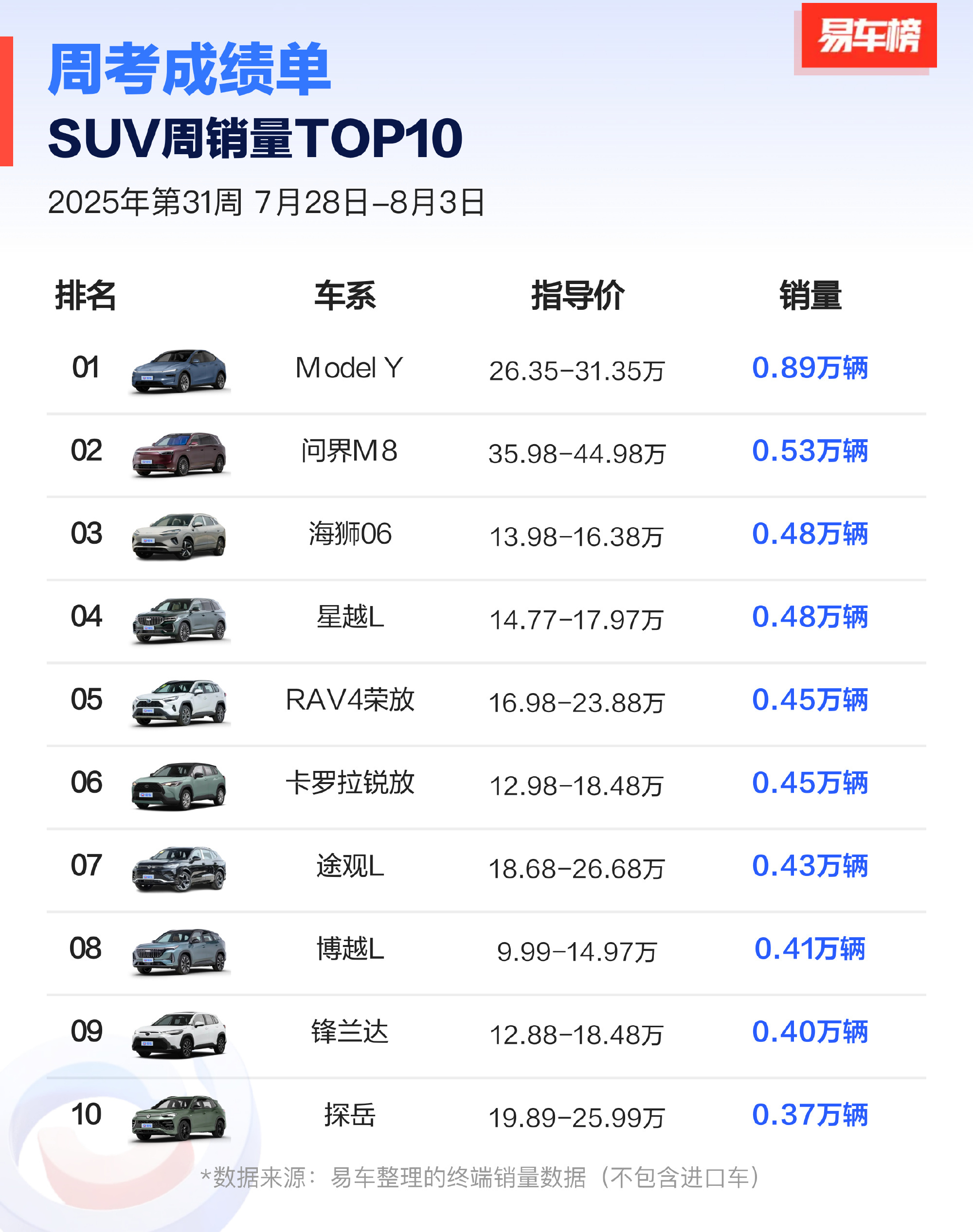 2025年8月5日,易车发布了2025年第31周(7月28日-8月3日)全车型及分级别车型周销量TOP10,在SUV销量TOP 10榜单中,特斯拉Model Y位列第一。