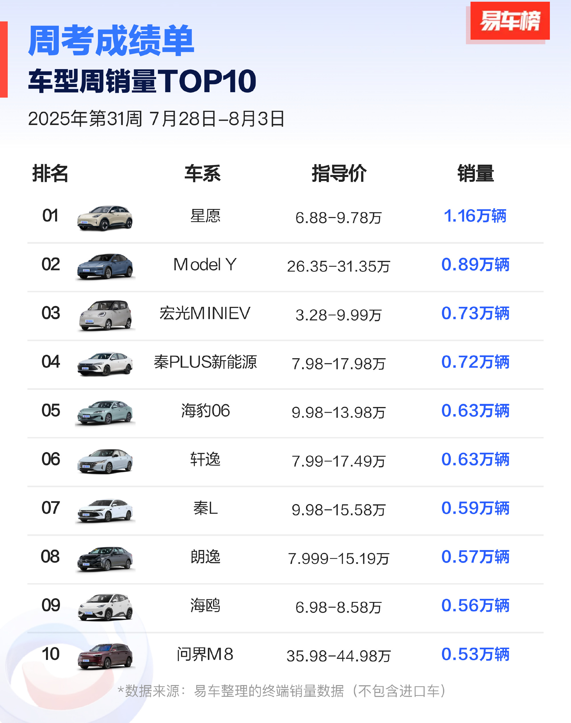 此外,易车还发布了全车型维度销量TOP 10榜单,前3名分别为星愿、Model Y、宏光MINIEV,周销量分别为1.16万辆、0.89万辆、0.73万辆。Model Y的销量和售价不足10万元的车型不相伯仲,从侧面反映出,该产品极具竞争力。