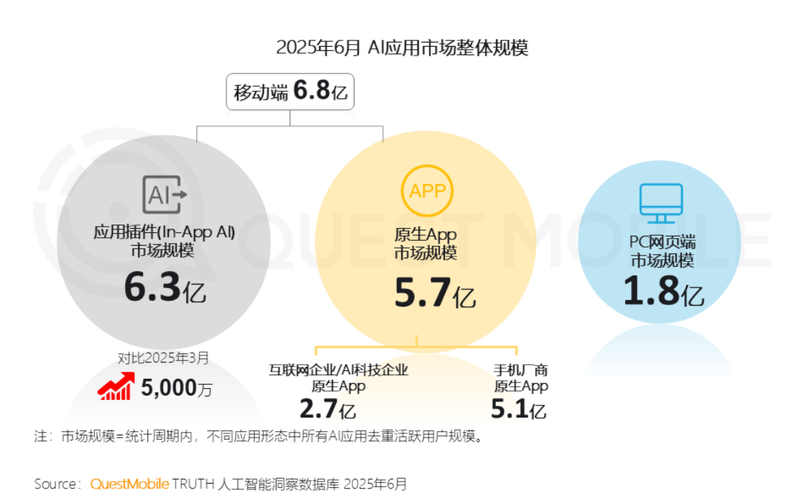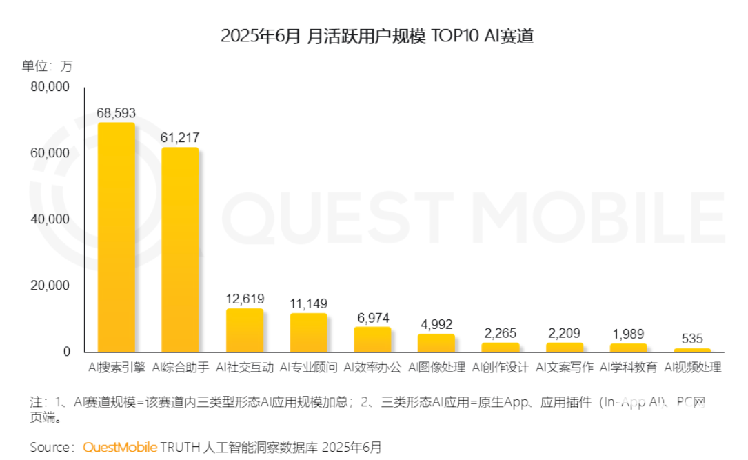 8月5日,QuestMobile发布2025年AI应用市场半年报显示,上半年国内AI应用移动端用户规模达6.8 亿。其中AI搜索引擎以6.85亿月活用户、AI综合助手以6.12亿月活用户领跑第一梯队,成为核心流量入口。