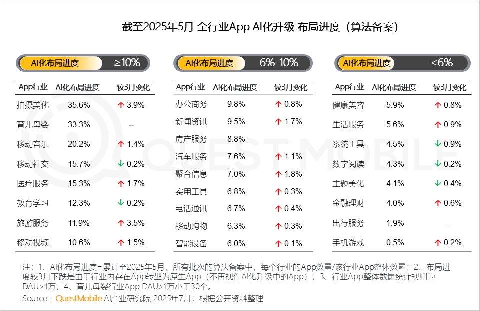 应用形态呈现显著“此消彼长”特征。移动端插件(In-App AI)用户规模达6.3亿,较3月增长0.5亿,成为用户首选;而原生App用户为5.7亿,PC网页端用户为1.8亿,分别下降0.2亿和0.3亿,反映出用户对“场景化工具”的偏好持续升温。行业布局方面,拍摄美化行业AI化进度最高,达35.6%;旅游服务行业以3.5%的增速快速追赶,AI技术正深度渗透垂直场景。资源集中化趋势明显,百度、腾讯、抖音、阿里、蚂蚁五大互联网集团占据移动端AI应用51.8%的有效Token消耗量(60.3万亿),在核心赛道形成垄断优势。