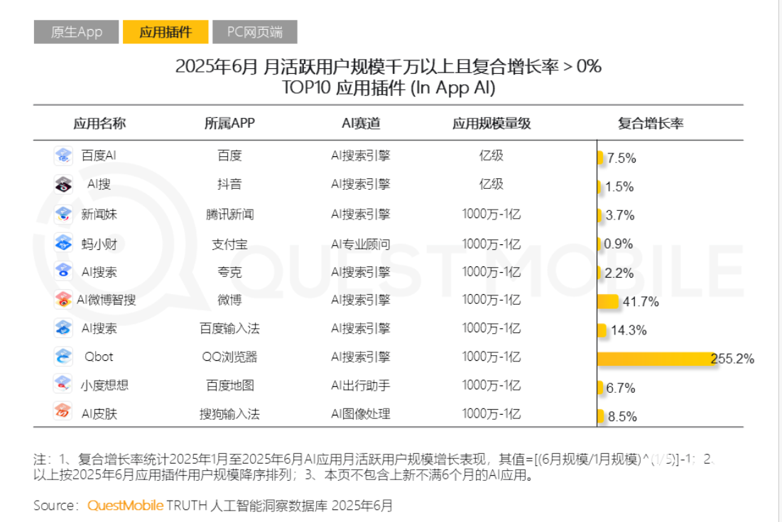 除此之外,增长结构呈现分化,插件类应用表现突出,QQ浏览器Qbot复合增长率达255.2%,AI微博智搜增长41.7%;原生App中腾讯元宝增长55.2%,但社交类应用下滑明显。值得注意的是,手机厂商原生AI助手虽有5.1亿预装用户,但主动使用率偏低,面临第三方应用分流压力。