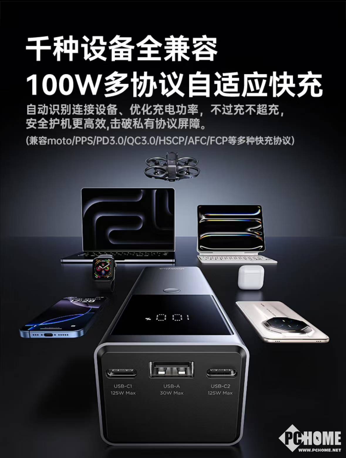 该产品采用车规级电芯,电池材料与新能源汽车同源,强调安全性与耐久性。USB-C单口最大输出功率达125W,可覆盖主流笔记本电脑的快充需求。产品支持PPS、PD 3.0、QC 3.0等多项主流快充协议,兼容多品牌手机、平板及笔记本设备。