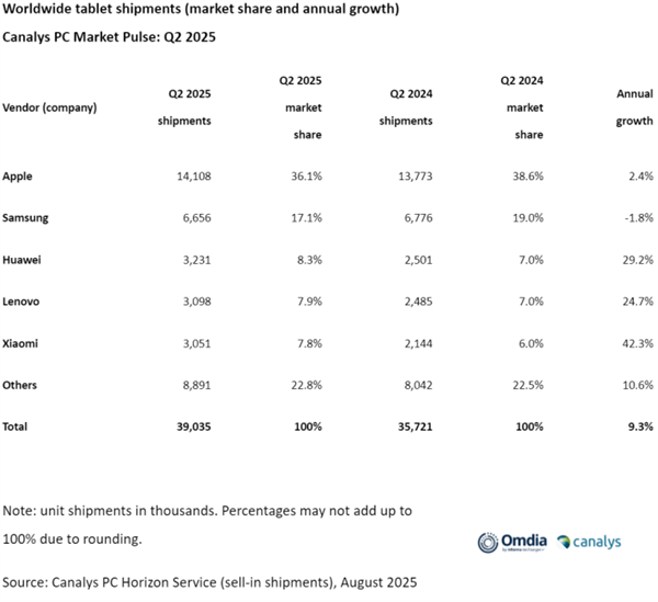 8月6日消息,根据市场研究机构Canalys与Omdia联合发布的最新数据,2025年第二季度全球平板电脑出货量达3900万台,同比上涨9%,环比增长5%。