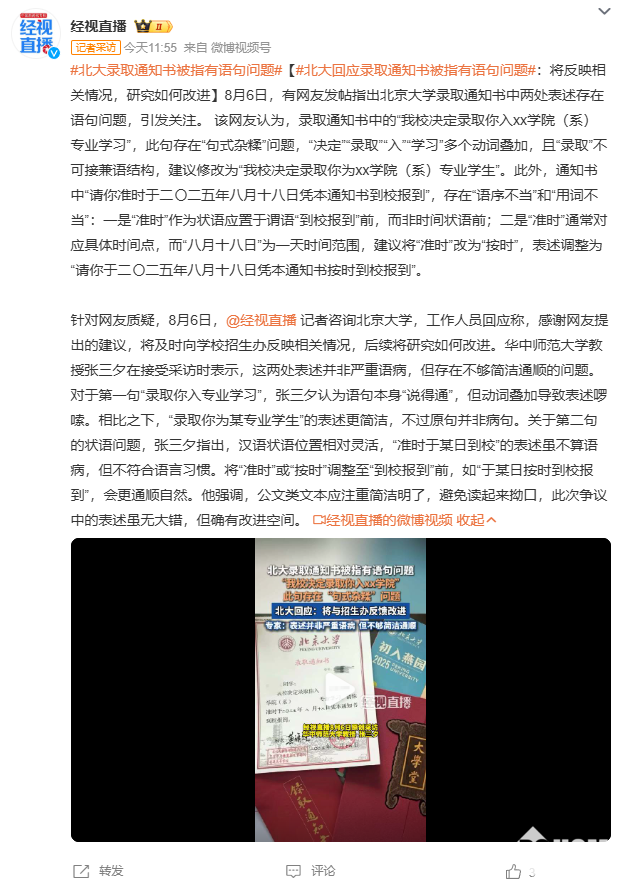 8月6日,根据经贸直播今日报道,有网友发帖指出北京大学录取通知书中两处表述存在语句问题,引发关注。