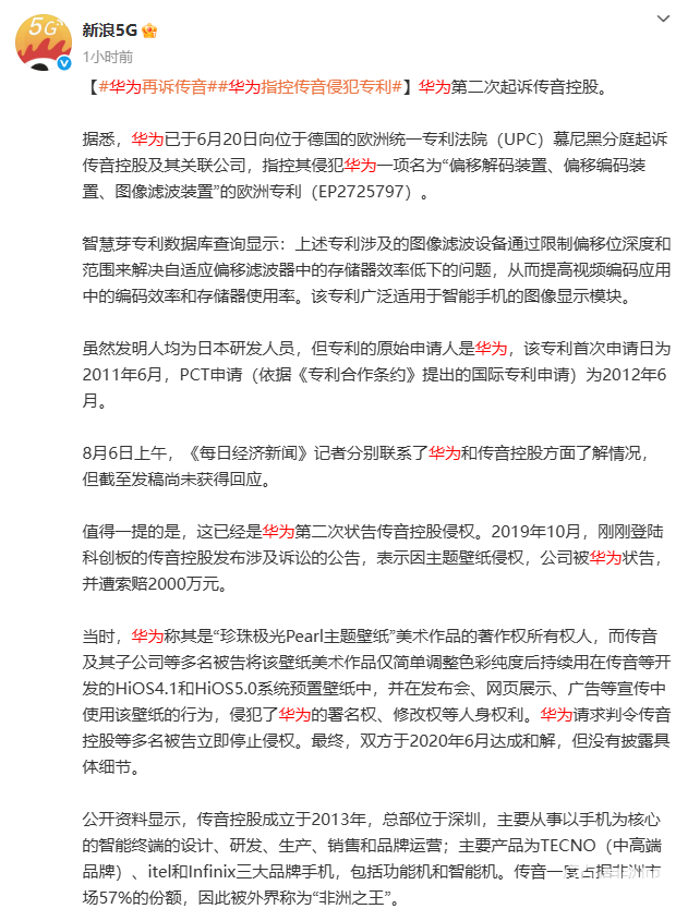 8月6日,据新浪5G今日报道,华为已于6月20日向位于德国的欧洲统一专利法院(UPC)慕尼黑分庭起诉传音控股及其关联公司,指控其侵犯华为一项名为“偏移解码装置、偏移编码装置、图像滤波装置”的欧洲专利。
