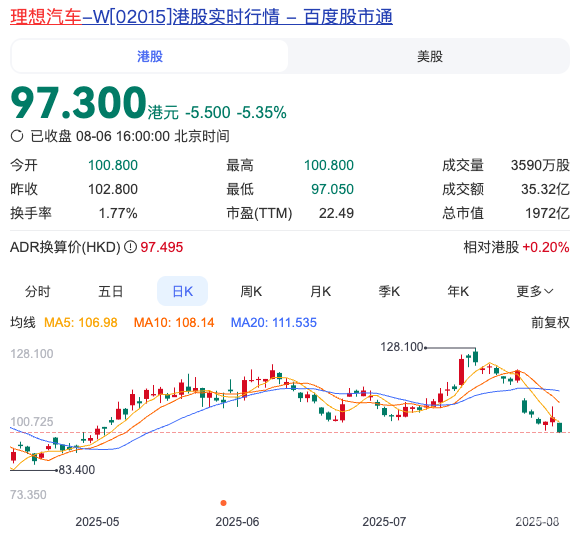 2025年8月6日,理想汽车港股股价跌破100港元/股,报收97.3港元/股,单日跌幅高达5.35%。