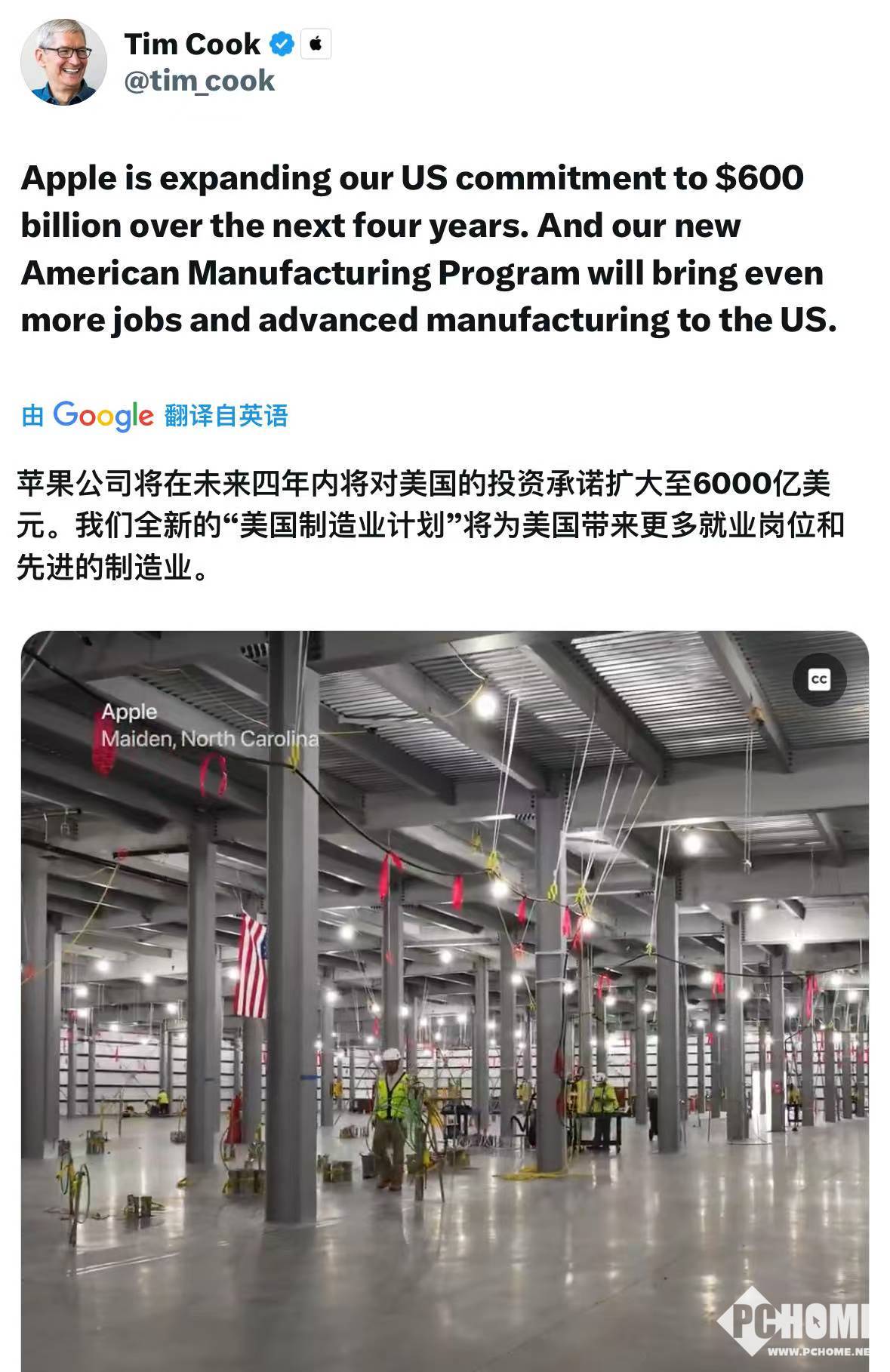 根据苹果CEO蒂姆·库克在社交平台发布的信息,该计划将在未来四年内推进,涵盖新建生产设施、扩大现有合作,以及技术研发等多个领域。苹果将在此框架下与包括康宁、GlobalWafers、德州仪器、博通等10家美国本土及境内运营的供应链企业深化合作。