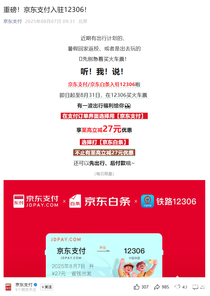 8月7日,京东支付官方公众号今日发文宣布,京东支付/京东白条入驻铁路12306。