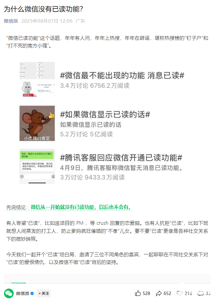 8月7日,微信派公众号今日发文表示,“微信已读功能”这个话题,年年有人问,年年上热搜,年年在辟谣,堪称热搜榜的“钉子户”和“打不死的南方小强”。并且在今日正式表态:“微信从一开始就没有已读功能,以后也不会有。”