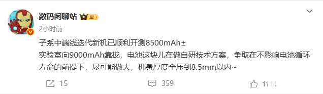 8月7日,据知名数码博主“数码闲聊站”今日爆料,REDMI中端新机已顺利测试8500mAh大电池,实验室还在做自研技术方案,争取在不影响电池循环寿命的前提下尽可能提升电池容量,机身厚度会控制在8.5mm以内。