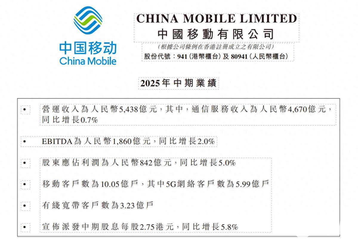 2025年上半年,中国移动实现归母净利润为842亿元,同比增长5%。上半年,中国移动全力锻造5G网络领先优势,5G网络投资共计258亿元,累计开通5G基站超259.9万个,净增18.7万个,全球率先实现核心网100%云化融合。