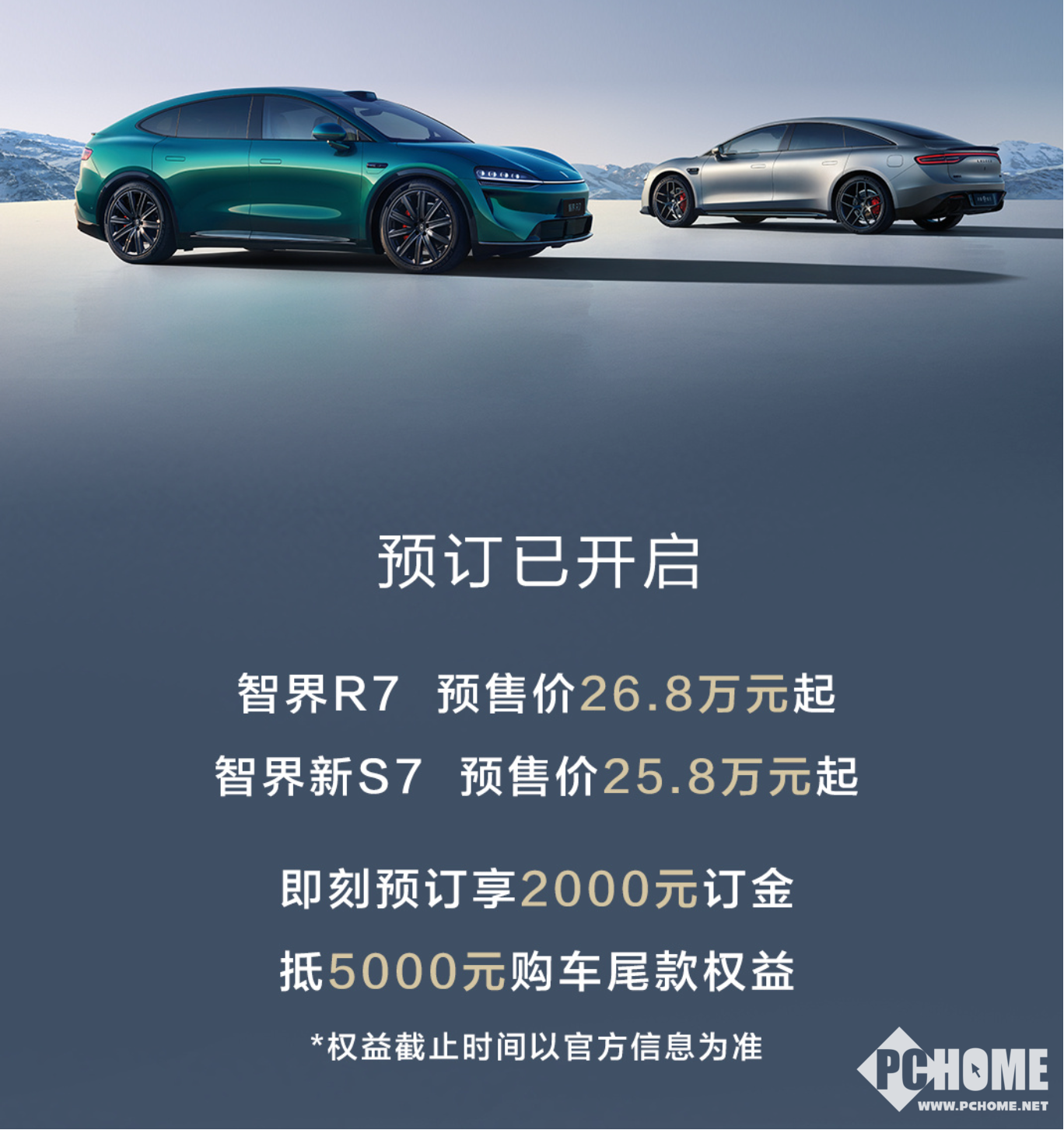 8月8日,智界新款车型R7与新S7正式开启预订。此次预订政策颇具吸引力,用户支付2000元定金,购车时可抵5000元尾款。智界R7预售价26.8万元起,新S7预售价25.8万元起。