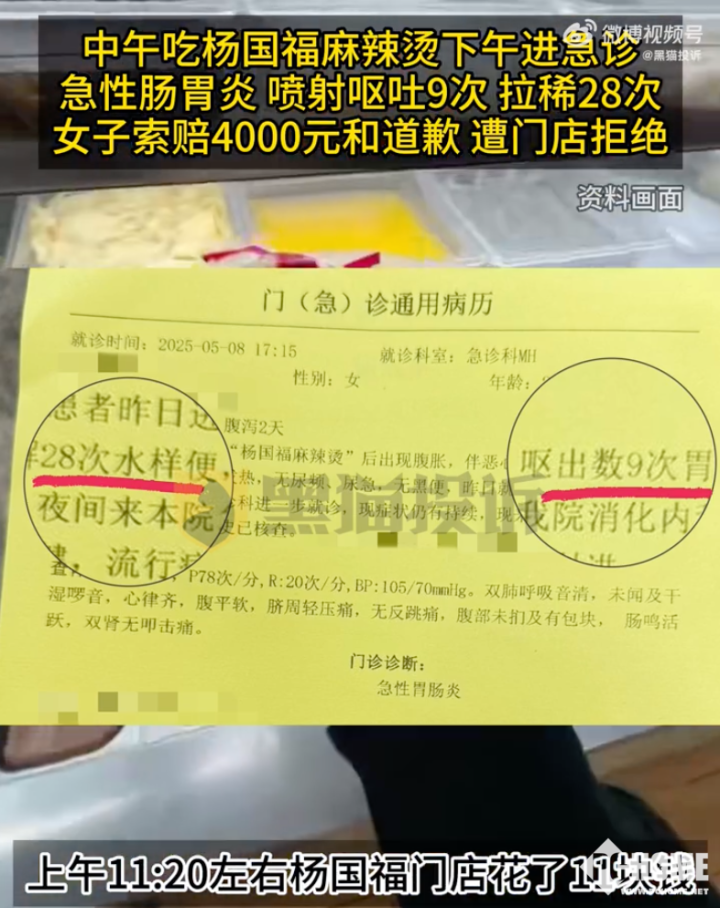 2025年8月8日,黑猫投诉报道,广州小李(化名)在公司楼下的杨国福麻辣烫吃饭,引发了急性肠胃炎,结果门店的反馈令人大跌眼镜。