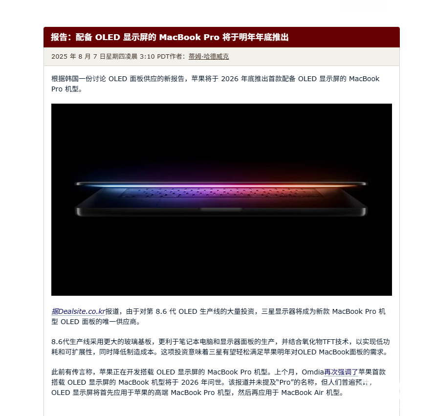 8月8日,据科技媒体MacRumors今日报道,苹果将于2026年末推出首款搭载OLED显示屏的MacBook Pro,由三星供屏。