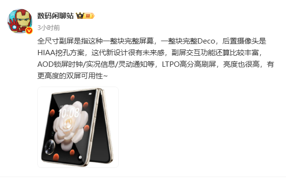 据该博主介绍,全尺寸副屏是指这种一整块完整屏幕,一整块完整Deco,后置摄像头是HIAA挖孔方案。此外,这块副屏的功能相当丰富,支持AOD锁屏时钟、实况信息和灵动通知等交互功能。并且小米16 Pro Max的这块副屏,采用LTPO高分高刷屏,亮度表现优异,具备高度的双屏使用性。
