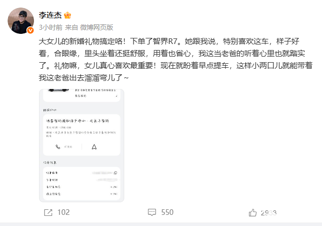 8月8日,知名影星李连杰今日在社交媒体平台上发文称,自己下单了一台新款智界R7作为大女儿的新婚礼物。