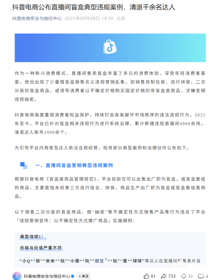 8月8日,抖音电商近期成立安全与信任中心,并发布首期治理公告,剑指直播间违规盲盒营销行为。据介绍,2025年以来,抖音电商已累计断播相关违规直播间4000余场,清退达人账号1000余个。
