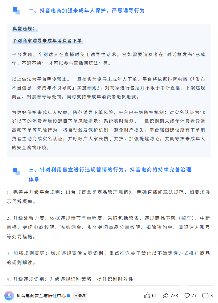 此外,抖音电商还将加强未成年人保护,严惩诱导行为。并且针对利用盲盒进行违规营销的行为,抖音电商将持续完善治理体系。