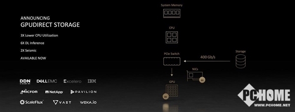 另外,NVIDIA还宣布了GPUDirect Storage技术,类似微软DirectStorage和自家游戏卡上的RTX IO,都是让GPU直接访问NVMe SSD而不需要经过CPU,号称可让CPU占用率降低3倍,DL深度学习推理性能提升2倍。