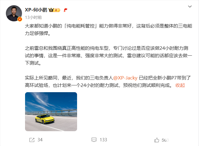 8月11日,小鹏汽车董事长何小鹏昨日发文表示,将把全新小鹏P7带到了高环试验场,也计划来一个24小时的耐力测试。