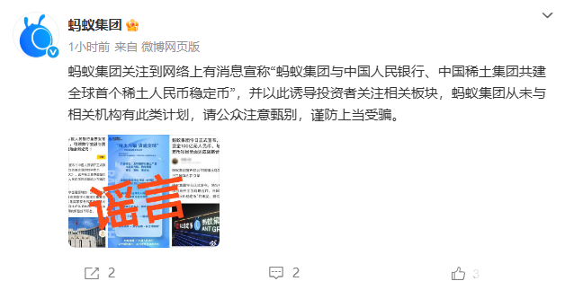 8月11日,蚂蚁集团官方今日发文辟谣表示,蚂蚁集团从未有“蚂蚁集团与中国人民银行、中国稀土集团共建全球首个稀土人民币稳定币”的计划,请公众注意甄别,谨防上当受骗。