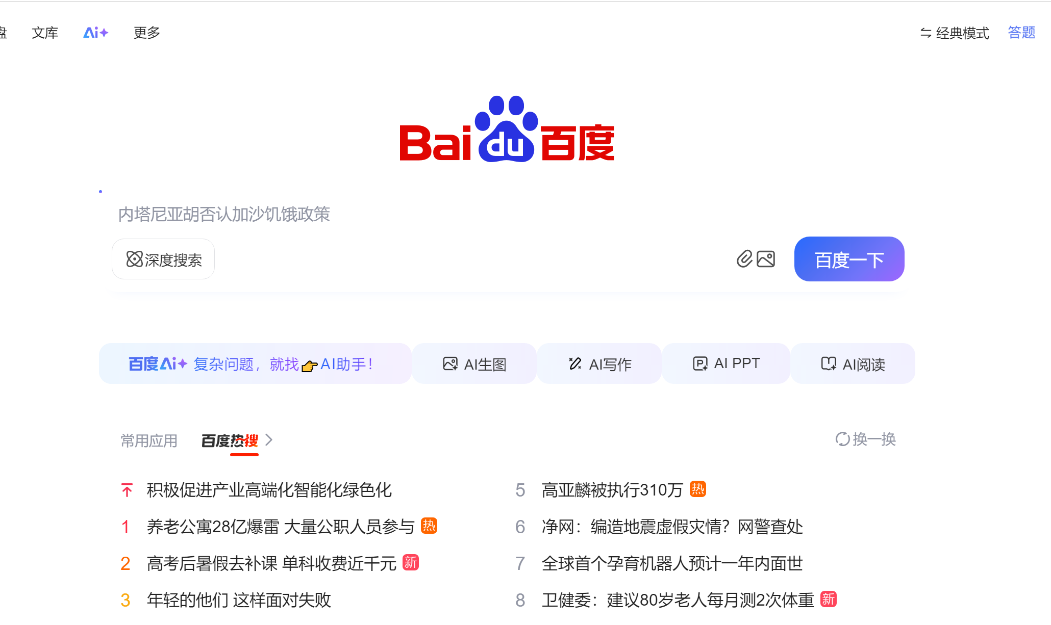 8月11日,百度宣布百度搜索PC端首页全量上线系列AI功能,将传统信息入口升级为任务中枢。升级后的首页新增“超级智能双行框”,支持一键深度搜索,可解答复杂问题;同时推出“工作台”模块,集成AI阅读、AI写作与AI PPT三大工具。