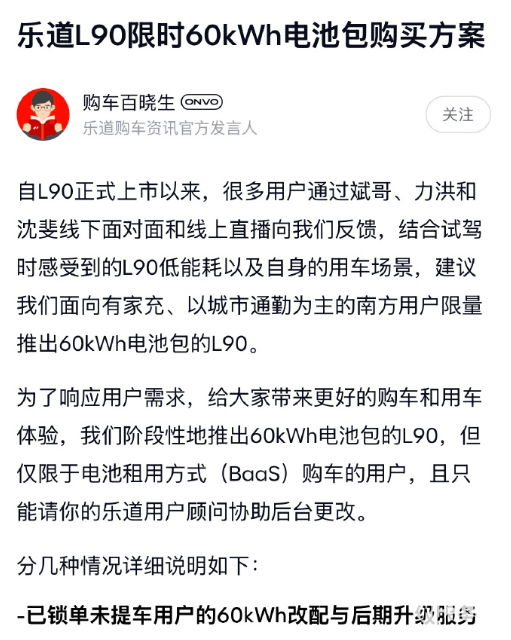 乐道针对旗下L90车型推出限时60kWh电池包购买方案,聚焦有家充、以城市通勤为主的南方用户需求。该方案仅面向采用电池租用方式(BaaS)购车用户,需通过乐道用户顾问协助后台更改配置。