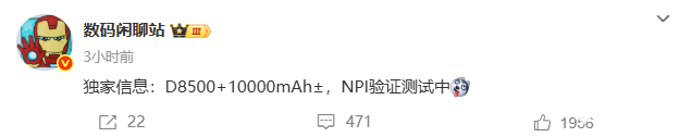 8月11日,知名数码博主“数码闲聊站”今日爆料,一款搭载天玑8500处理器以及10000mAh大容量电池的手机已进入新产品导入(NPI)阶段。结合该博主的爆料习惯以及此前信息,该手机预计为荣耀旗下新品。