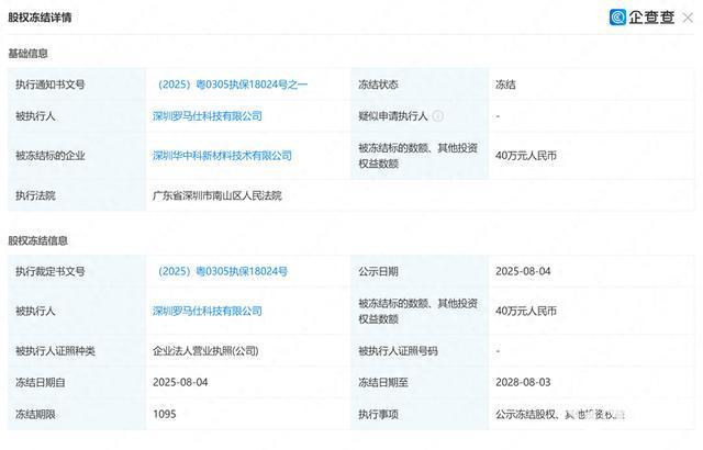 8月11日,国家企业信用信息公示系统显示,深圳华中科新材料技术有限公司新增一则股权冻结信息,被执行人为深圳罗马仕科技有限公司,冻结股权数额为40万元人民币,冻结期限为3年,执行法院为深圳市南山区人民法院。