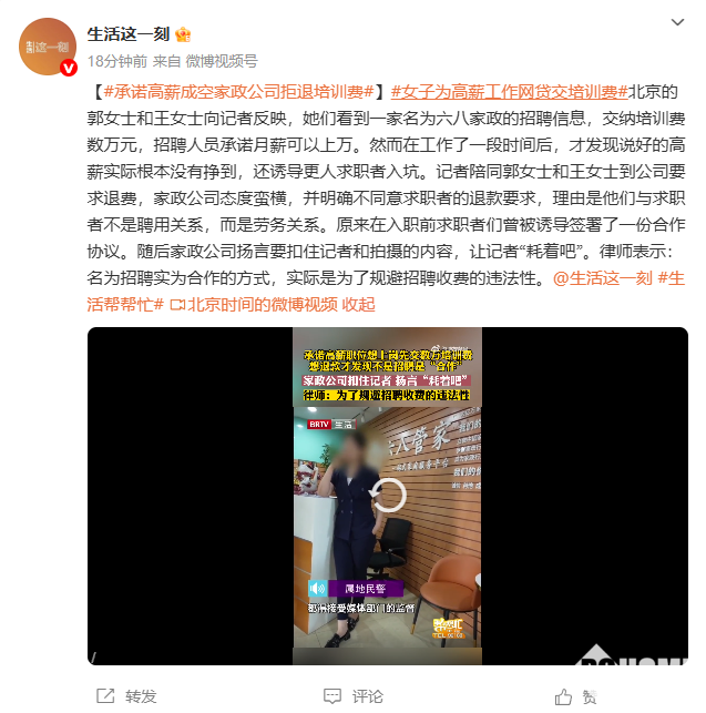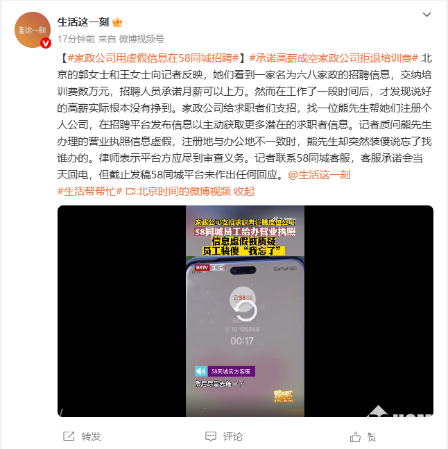 8月11日,据北京广播电视台生活频道《生活这一刻》官方账号报道,一家名为六八家政的公司使用虚假信息在58同城上进行招聘,还需要缴纳数万元的培训费,且承诺月薪过万。但最后高薪不仅落空,培训费也拒不退还。