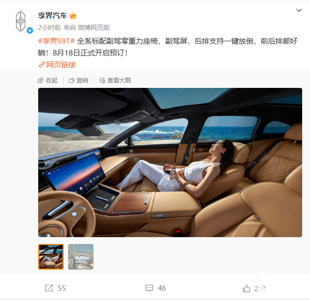 8月12日,享界汽车官方首次公布了享界S9T的内饰官图,全系标配副驾零重力座椅、副驾屏,后排支持一键放倒,新增“赤茶橘”内饰,并且宣布将于8月18日正式开启预定。