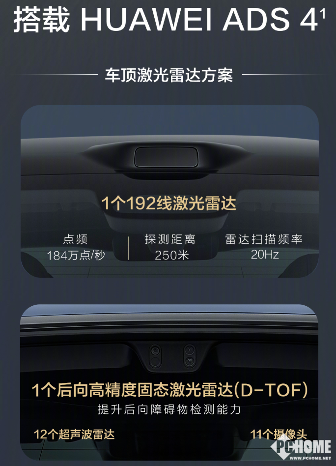 全新问界M7外观延续家族鲲鹏设计语言,星环双翼大灯与外阔式格栅兼具科技感与经典美学。智能驾驶方面,全新问界M7搭载HUAWEI ADS 4 ,车顶配备1个192线激光雷达(点频184万点/秒、探测距离250米、扫描频率20Hz )、1个后向高精度固态激光雷达(D-TOF )、12个超声波雷达、11个摄像头及5个4D毫米波雷达,探测性能全面提升;舱内首发电光方案,可应对复杂光线与异形障碍物检测。