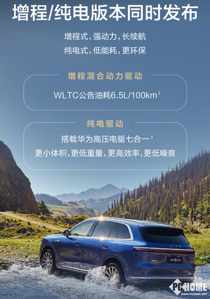 动力上,全新问界M7增程、纯电版本同步发布。增程式WLTC油耗6.5L/100km ,纯电搭载华为高压电驱七合一,高效低噪。全系标配宁德时代电池,增程版有37度电/53度电可选,综合续航超1600公里;纯电版100度电,续航超700公里。
