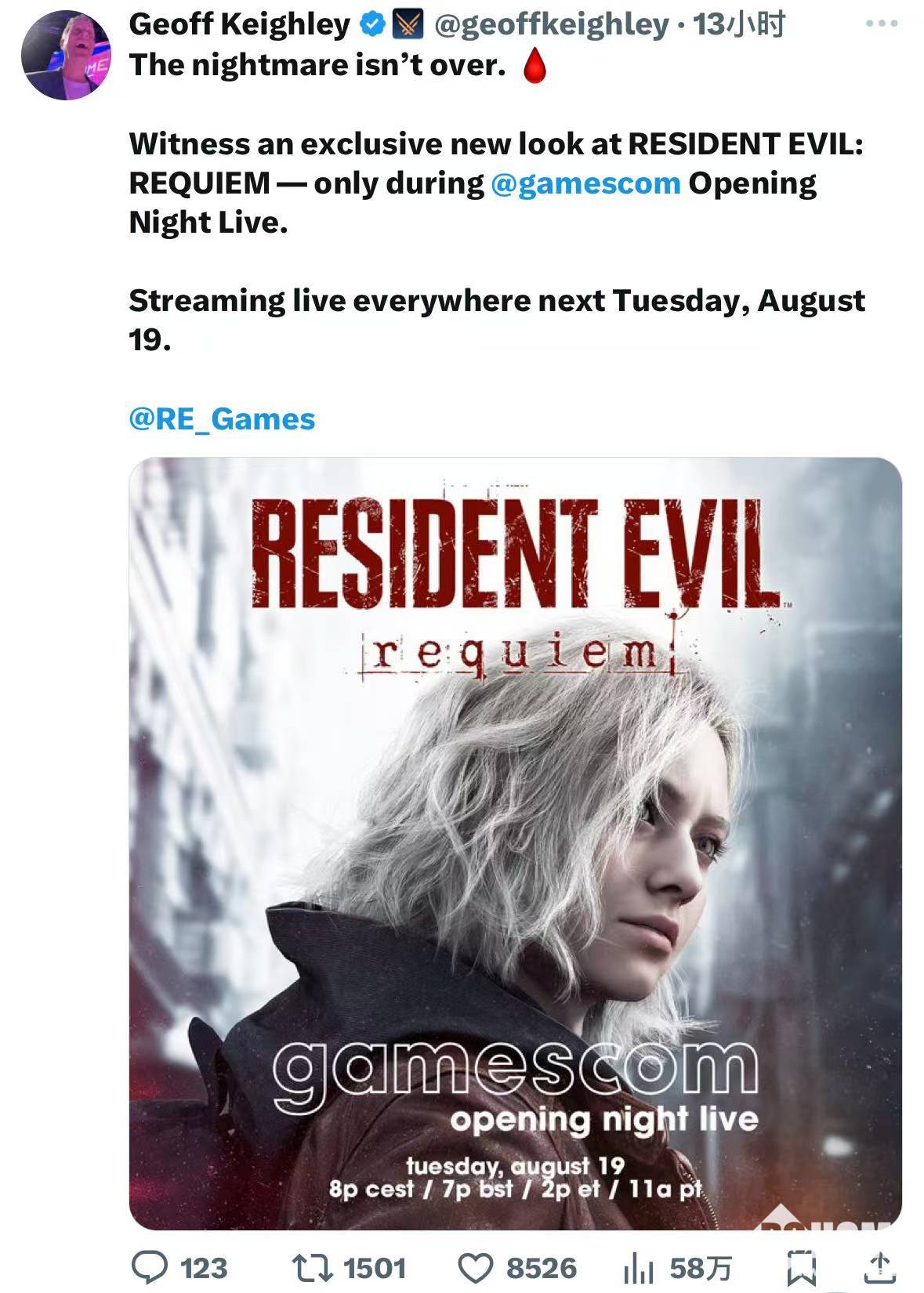 卡普空旗下新作《生化危机:安魂曲》将在8月19日科隆游戏展开幕之夜直播中发布最新预告片。未能亲临现场的玩家可通过直播获取独家内容,8月20日至24日期间前往科隆展的观众可现场体验游戏试玩。