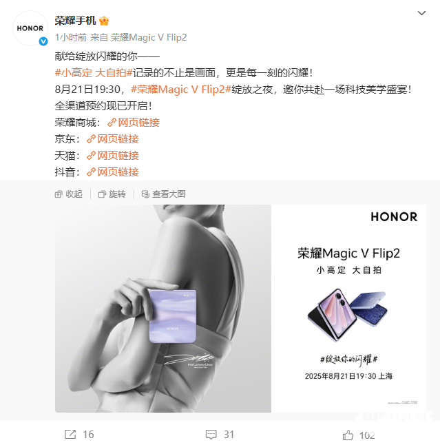 8月13日,荣耀手机官方今日发文宣布荣耀Magic V Flip2正式定档8月21日发布,现全渠道预约已开启。