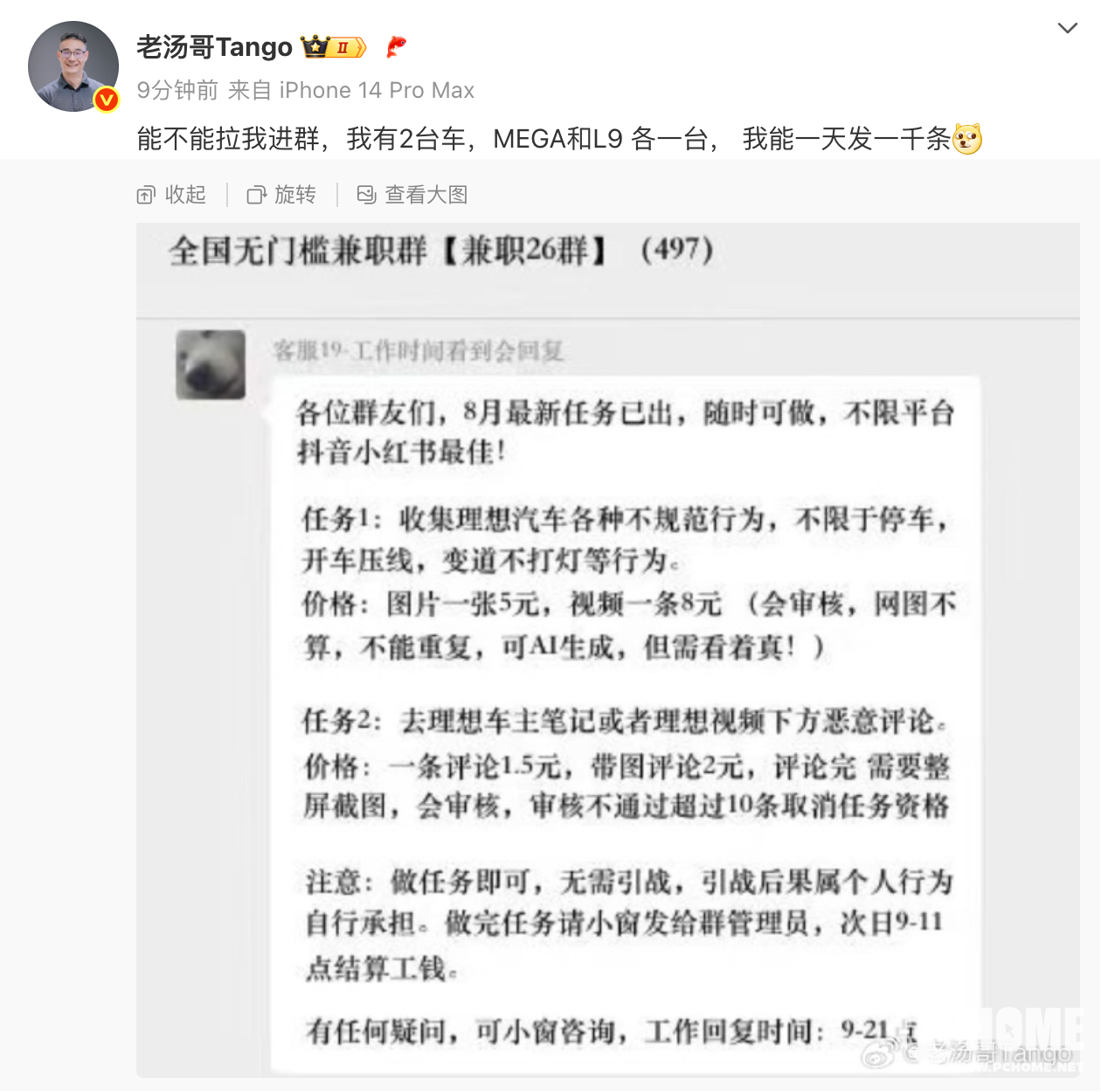 值得注意的是,前几日,理想汽车CEO李想在社交媒体平台表示,i8发布的时候,出现大量的这些舆情事件。每一次背后都有一个不同的品牌叫操控。这一次我们也知道哪个品牌在操控,但是其实背后也都是专业的水军机构。
