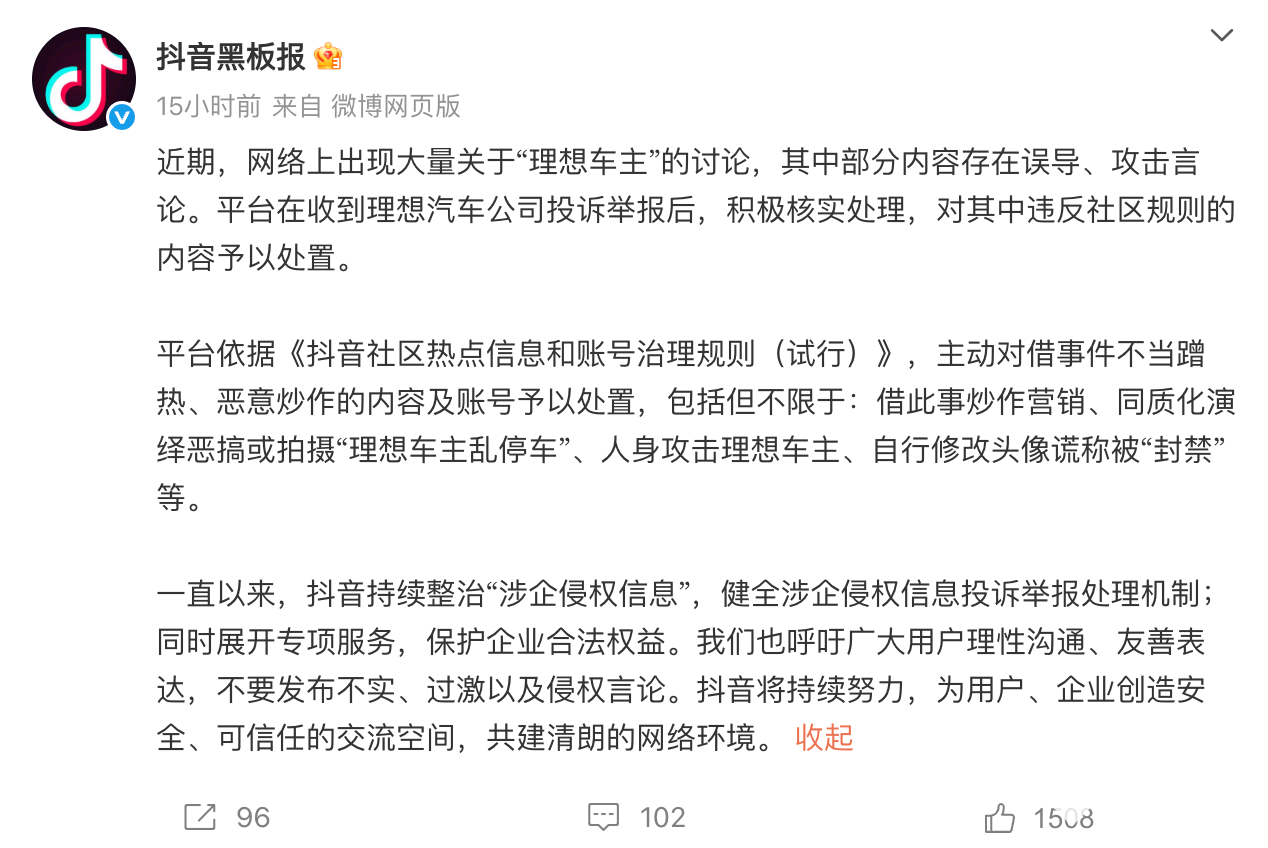 近日,抖音平台针对网络上大量涉及“理想车主”的不实讨论及恶意攻击行为展开专项整治。在收到理想汽车公司的投诉举报后,平台迅速核实,依据《抖音社区热点信息和账号治理规则(试行)》,对违反社区规则的内容及账号进行处置。