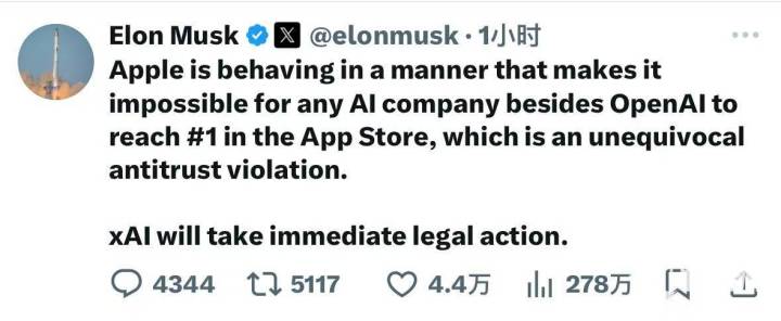 马斯克于当地时间8月11日在社交媒体平台发文称,苹果的行为使得除OpenAI之外的任何人工智能公司都无法在App Store中排名第一,这无疑违反了反垄断法,xAI将立即采取法律行动。他还质疑,X平台作为全球排名第一的新闻应用,Grok在所有应用中位居第五,为何苹果拒绝将它们列入App Store的“必备”类别。然而,马斯克并未提供相关证据支撑其指控。