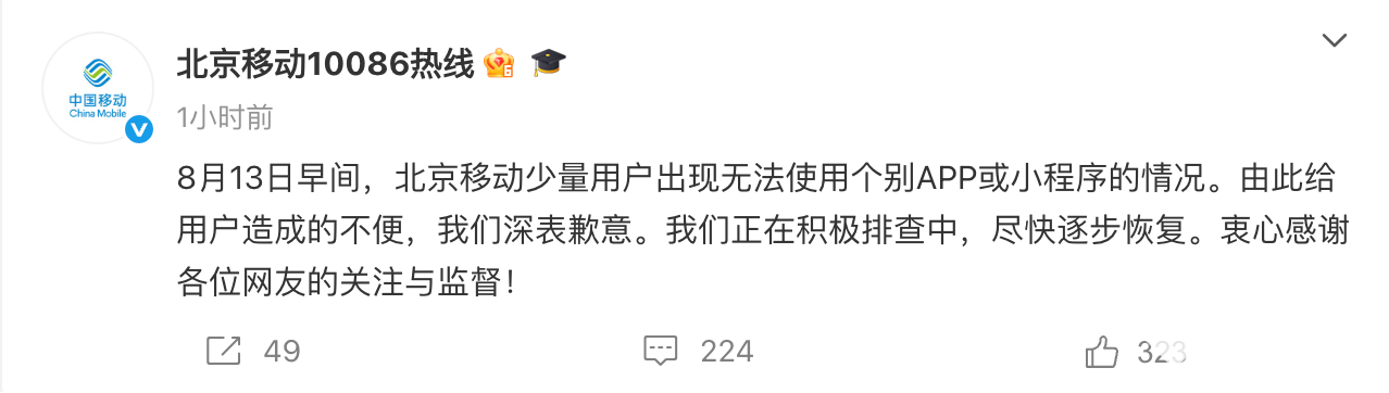 对此,北京移动官方客服账号“北京移动10086热线”在社交媒体平台发文称,“8月13日早间,北京移动少量用户出现无法使用个别APP或小程序的情况。由此给用户造成的不便,我们深表歉意。我们正在积极排查中,尽快逐步恢复。衷心感谢各位网友的关注与监督!”