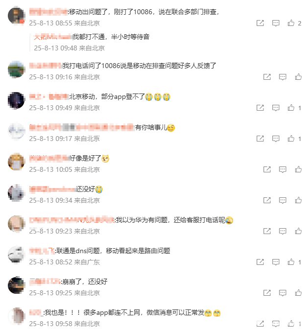2025年8月13日早间,多名北京移动用户在社交媒体集中反映网络异常问题,引发广泛关注。不少网友直言“天塌了”,还有用户称自己“两张卡都是移动的”,使用受阻带来不便。