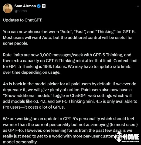 据介绍,Auto模式适用于大多数普通对话,系统将智能判断选择速度优先或深入推理模式。复杂任务可切换至Thinking模式,该模式具备高达19.6万token的上下文处理能力,支持每周最多3000条深度消息;超过限额后将自动降级至Thinking mini版本继续服务。Altman强调,该消息上限将根据用户使用情况进行动态调整。