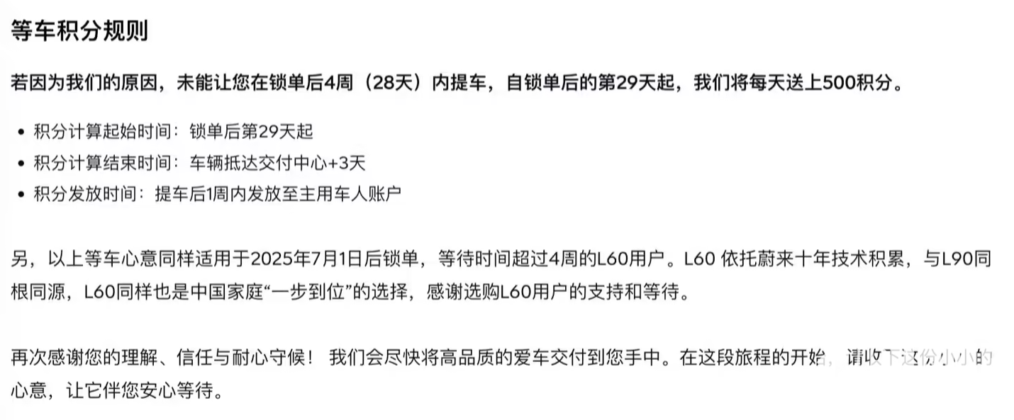 8月13日,乐道汽车在其官方APP发布通知,针对L90车型推出“等车积分”政策。自用户锁单29天起,若因乐道方面原因未能按时交付,每延迟一天,用户将获赠500积分。