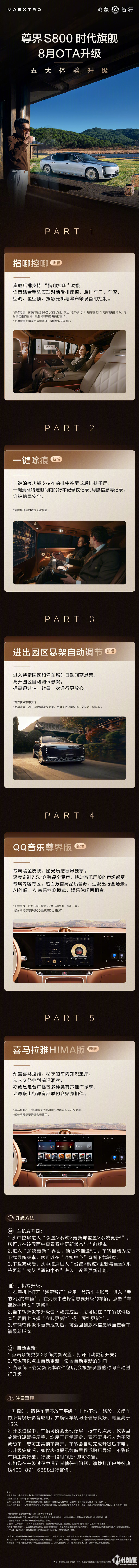 升级内容显示,尊界S800新增专属黑金主题界面,并针对音响系统进行优化,搭载10声道全景声技术,支持AI伴唱与音乐疗愈功能。车机端同步预装喜马拉雅有声内容库,涵盖人文、科技及广播节目等资源,强化“移动第三空间”的娱乐与舒适属性。