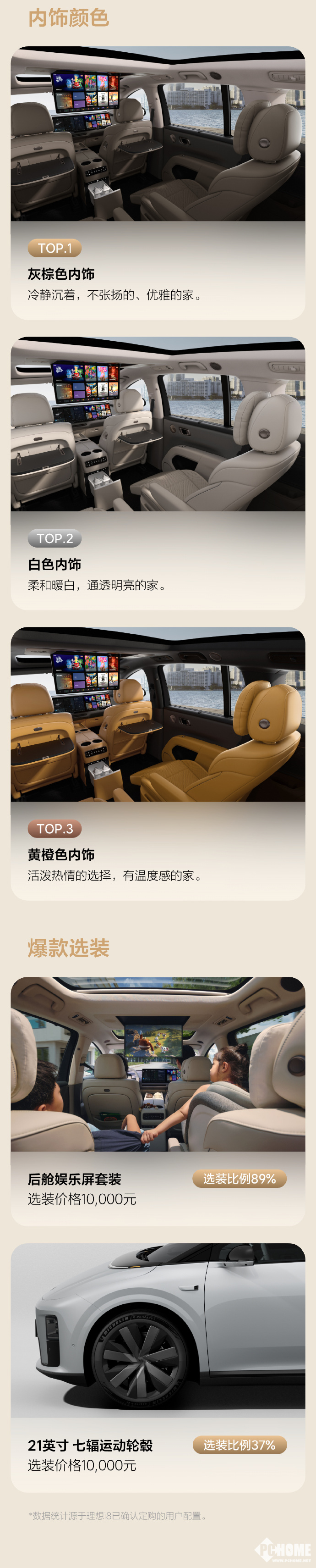 值得注意的是,理想汽车官微公布了理想i8预定配置分布情况,理想i8预定排名前三的车漆分别为白色珍珠漆、银色金属漆、黑色金属漆;预定排名前三的内饰颜色分别为灰棕色、白色、黄橙色。此外,预定理想i8的用户中,加价1万元,选配后舱娱乐屏套装的占比为89%;21英寸运动轮毂的选装比例仅为37%。