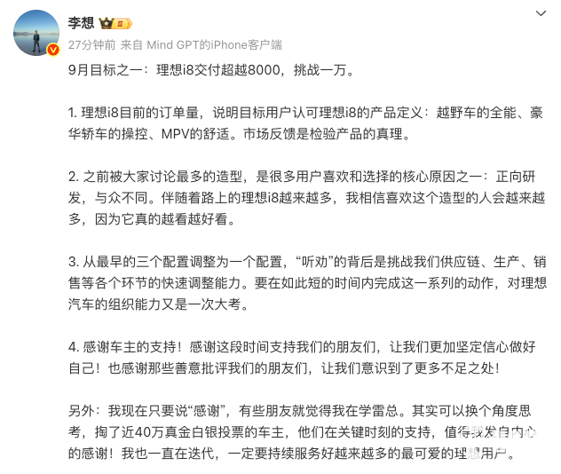 2025年8月13日,理想汽车CEO李想在社交媒体发文称,9月目标之一为:理想i8交付超越8000辆,挑战一万辆。