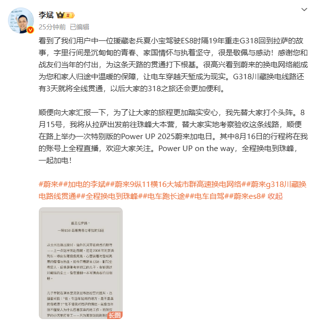 此次行程中,8月16日的旅程将通过李斌个人账号进行全程直播。蔚来计划在此次行程中举办特别版“Power UP 2025蔚来加电日”活动。李斌在发文中还特别提到一位援藏老兵驾驶ES8重走G318的故事。