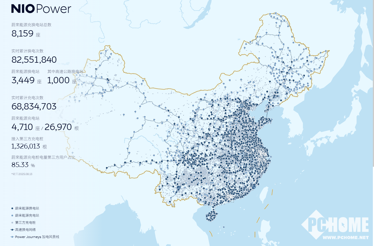 截至今日,蔚来已在全国建成3449座换电站,其中高速公路换电站达1000座,超充站数量为4710座,充电桩26970根,并接入第三方充电桩1326013根。