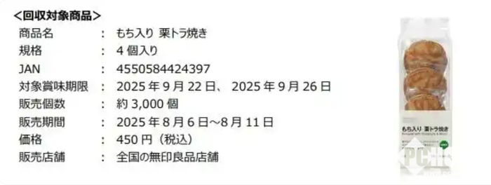 日本良品计画公司今日宣布,因原料中可能混入异物,自主召回旗下无印良品品牌4枚装栗子铜锣烧。涉事批次保质期至2025年9月22日及26日,共约3000个商品。