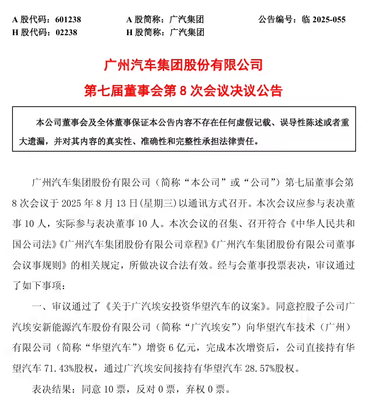 8月13日,广汽集团发布公告,其第七届董事会第8次会议于当日召开,会议审议通过《关于广汽埃安投资华望汽车的议案》。公告显示,广汽集团同意控股子公司广汽埃安向华望汽车技术(广州)有限公司增资6亿元。