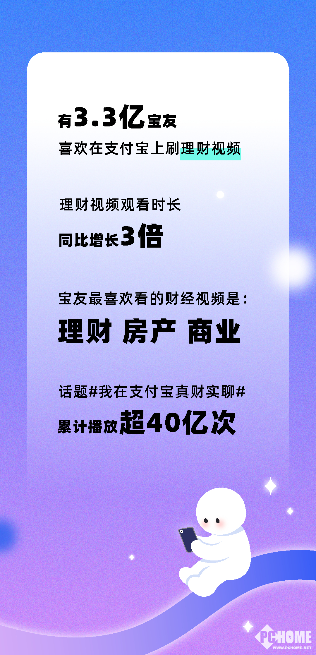 2025年8月13日,支付宝官微发文指出,过去一年,越来越多的宝友开始来支付宝刷财经视频,有3.3亿宝友喜欢在支付宝上刷理财视频、理财视频观看时长同比增长3倍、宝友们最爱看的财经视频是理财\房产\商业、话题“我在支付宝真聊实财”累计播放超40亿次。
